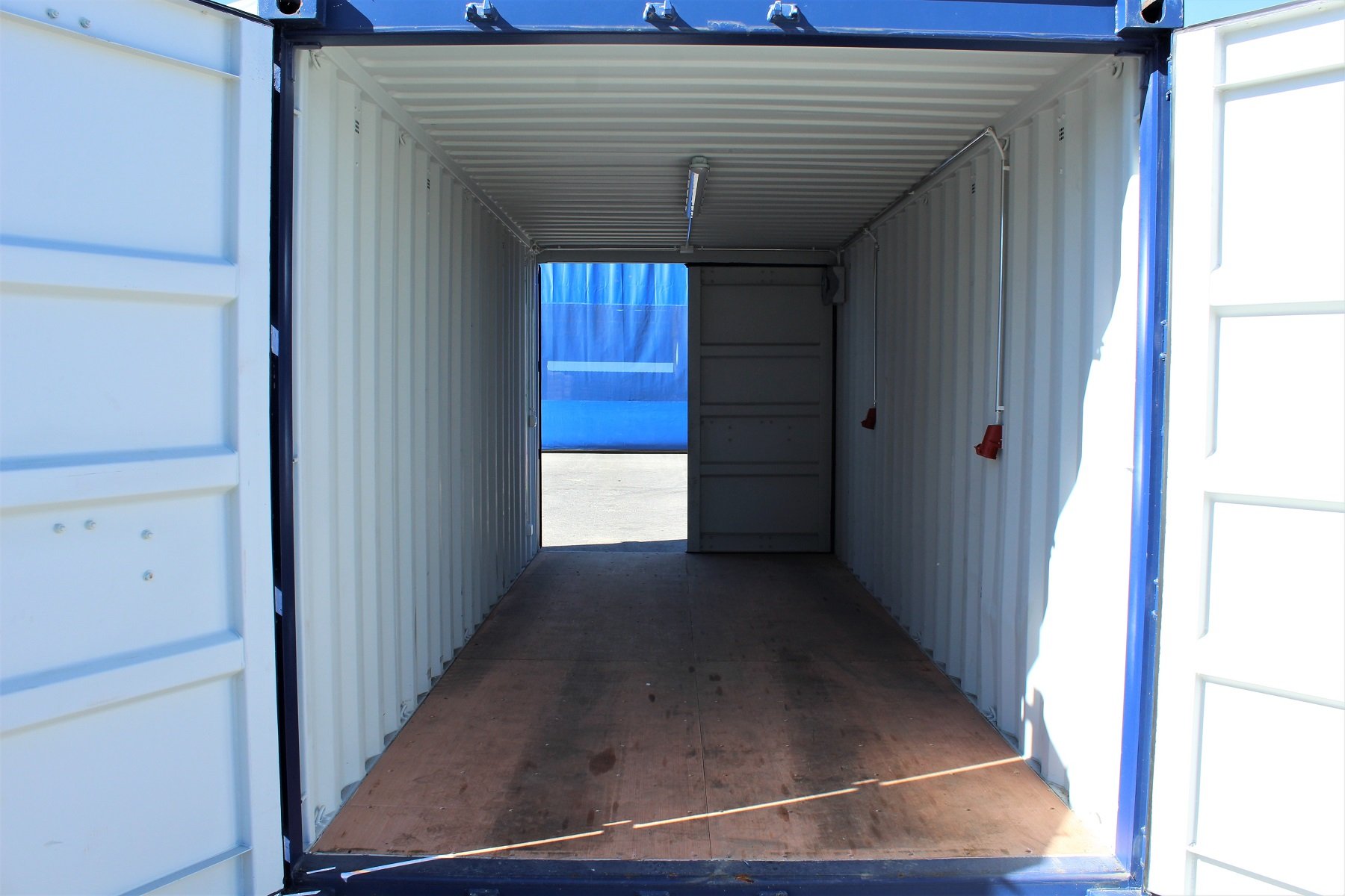 - 20′ Double Door (DD) -merikontti, jossa vakiona pariovet molemmilla lyhyillä sivuilla. Lattia vaaleaa bambua.