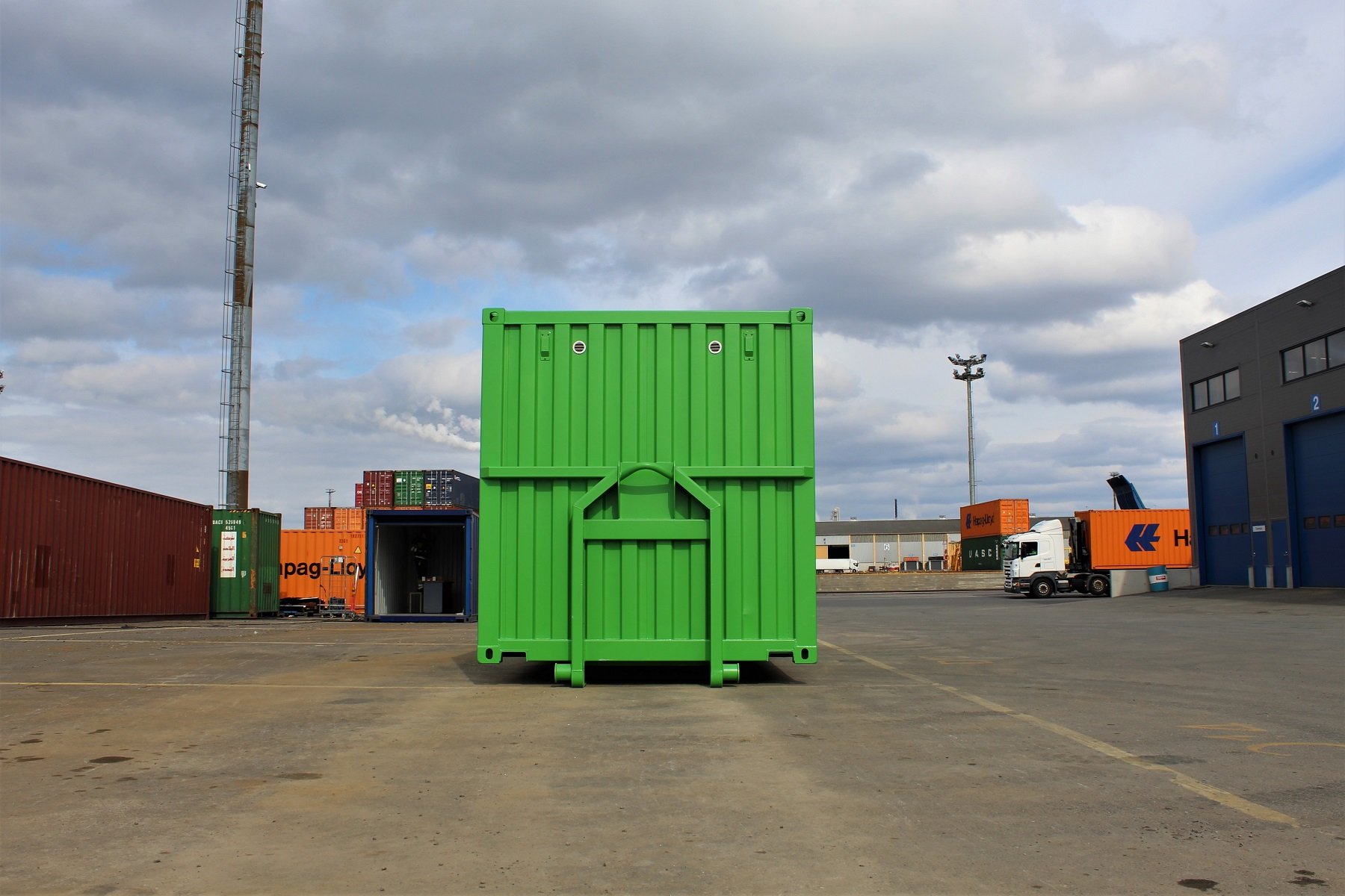 - Iso, sisäänrakennettu sammutusvesisäiliö, joka vie suuren osan kontin tilavuudesta.